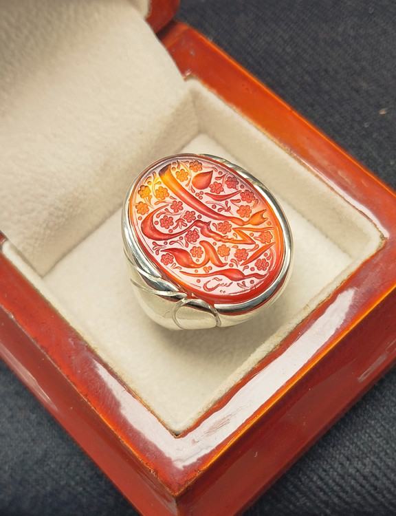 انگشتر دستساز خطی عقیق خراسان دورنگ خط شریکه الحسین زینب بصورت کاملا دستی امضا یس اثر استاد معصومی